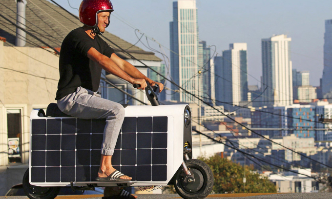 Chiếc scooter với các tấm năng lượng mặt trời,được thiết kế trông như một chiếc yên ngựa. Ảnh: Otherlab