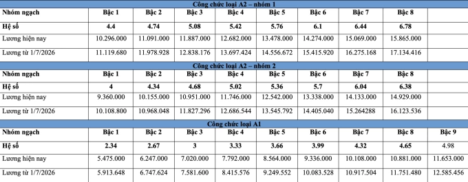 Bảng lương công chức dự kiến từ 1/7/2026 như sau: